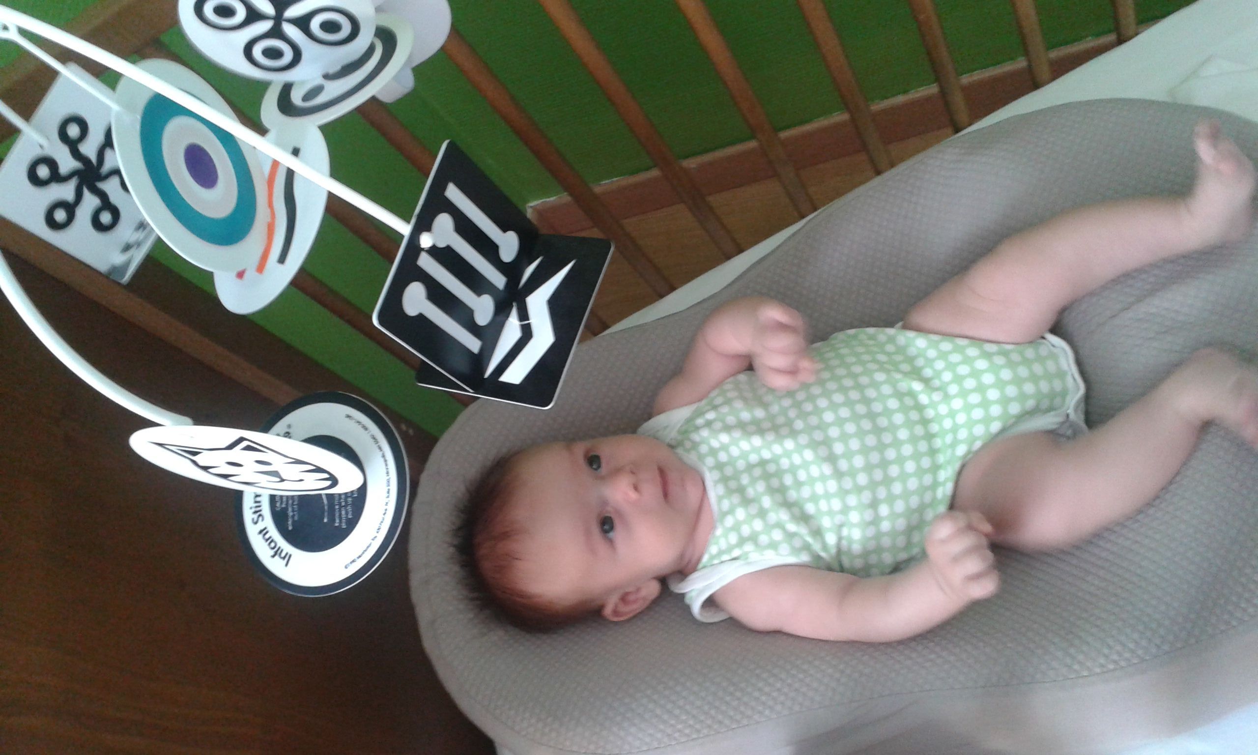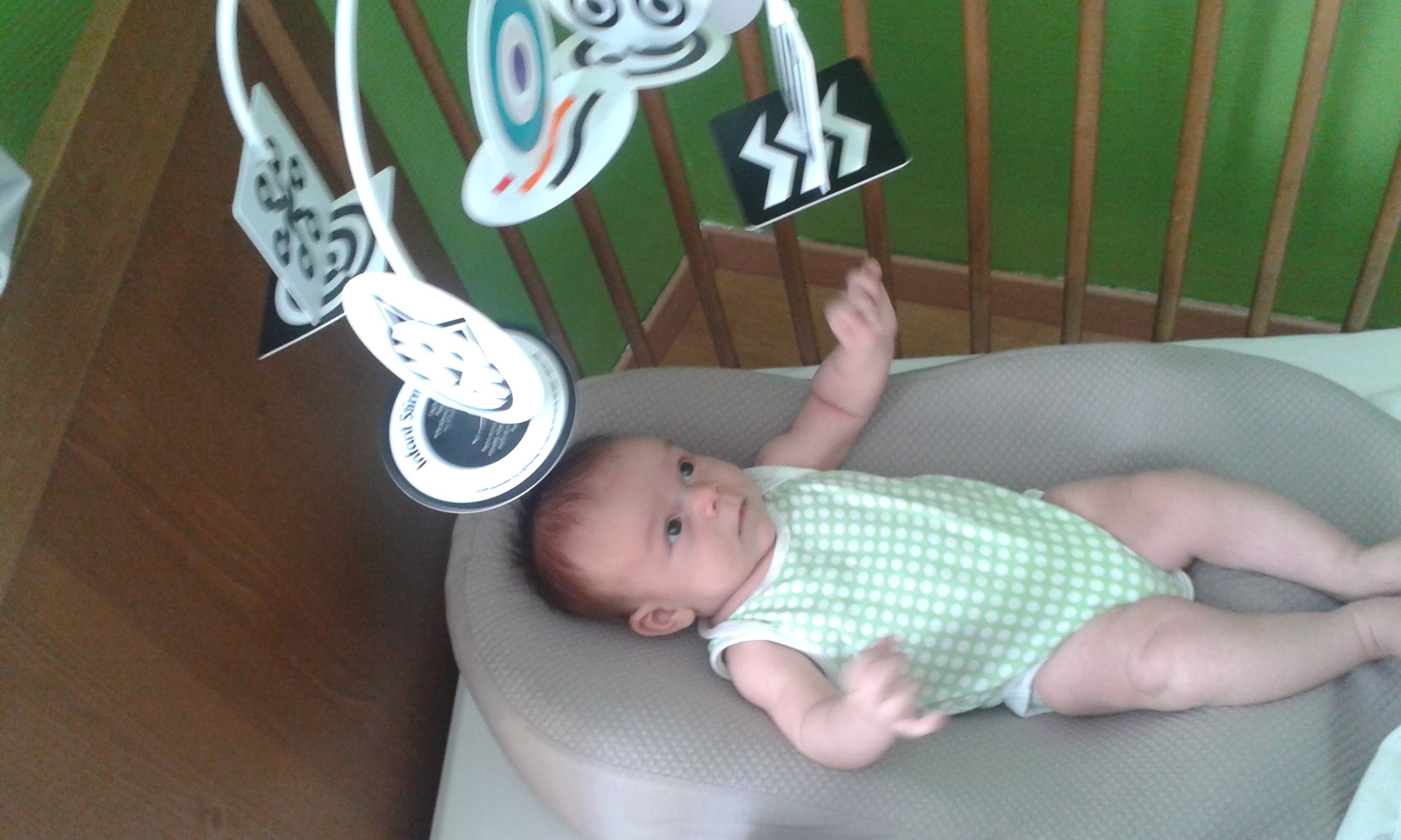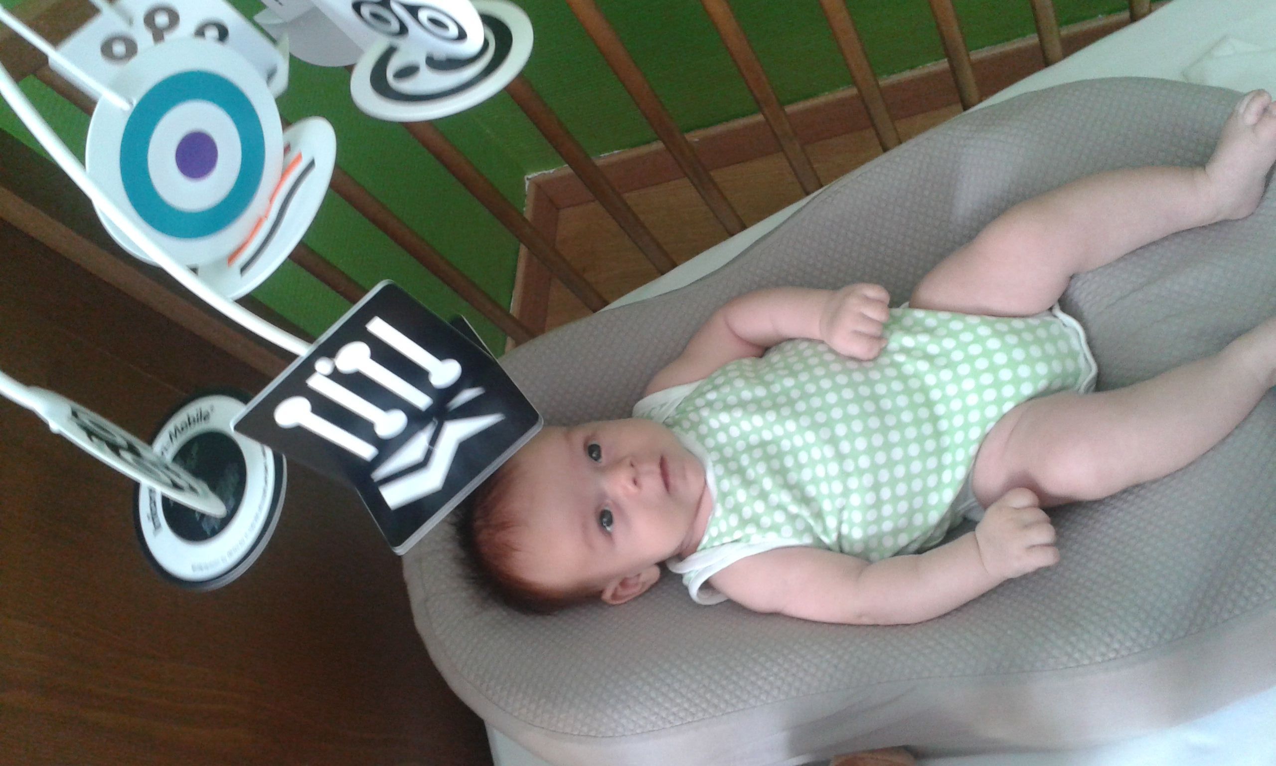 I realized the other day that I got a black and white book from my friend [i.e. Aunt Nina] a few years back and that babies supposedly love black and white books. Well, ours surely does – he likes to look at it and we can actually use it to distract him when he fusses.