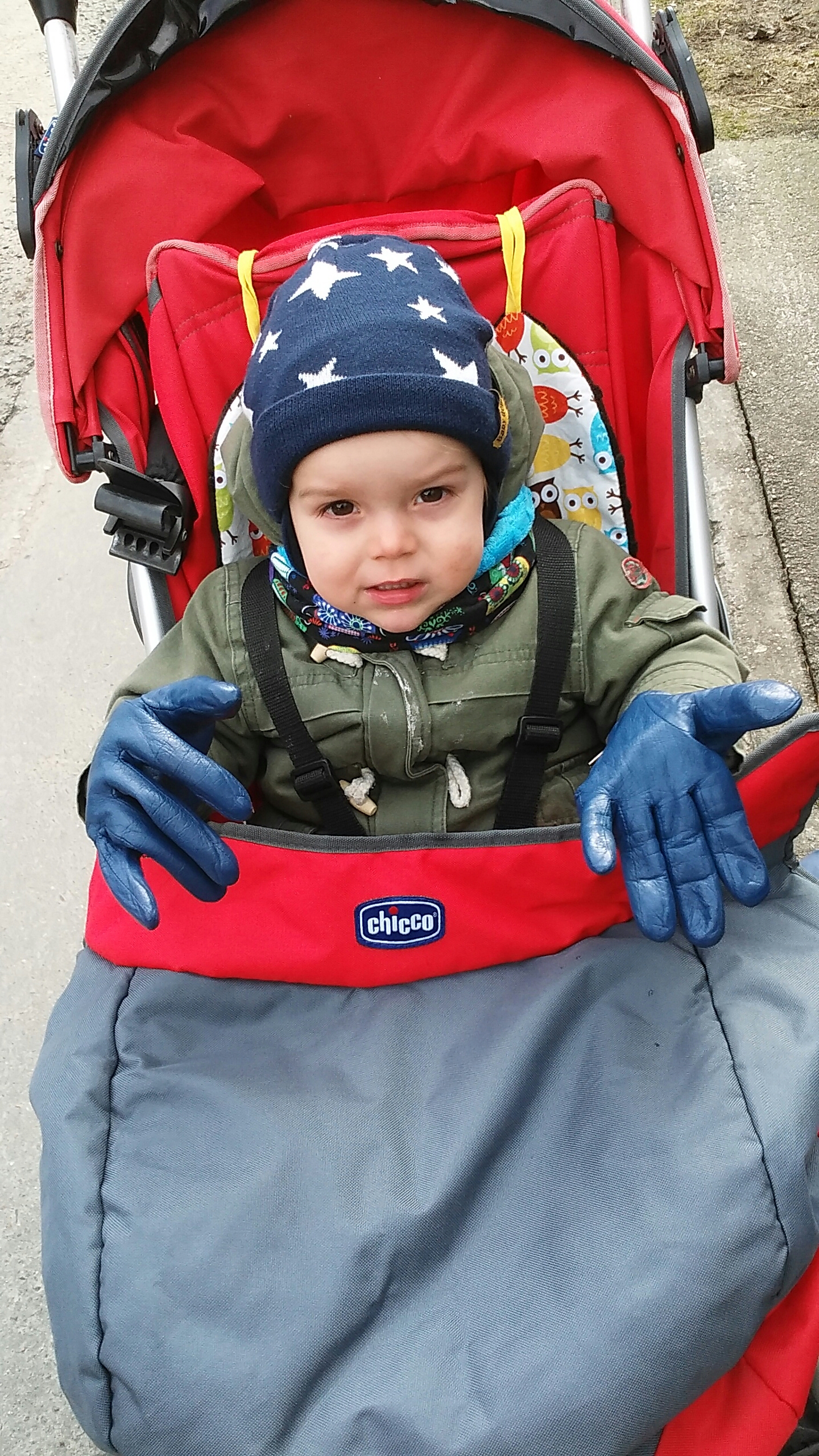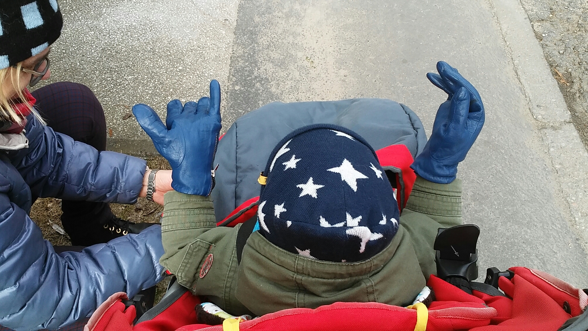 Supersize my hands Winters in Poland can be cold. This is what happens when you refuse to wear your own gloves. (we managed to get him some baby gloves that he accepts but this was our temporary solution)